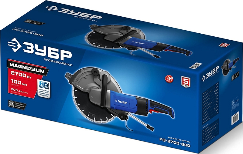 Электрический резчик по бетону Зубр Профессионал РЭ-2700-300 (Zubr Professional RE-2700-300) предназначен для наиболее трудных и глубоких (до 100 мм) резов любых материалов – бетона, асфальта, бордюров, металла, кирпича. Высокая мощность двигателя в сочетании с передаточным отношением редуктора дает большой крутящий момент на валу, что позволяет резать быстро и эффективно. Эффективный пылеотвод или работа с подачей воды защищают компоненты от пыли.