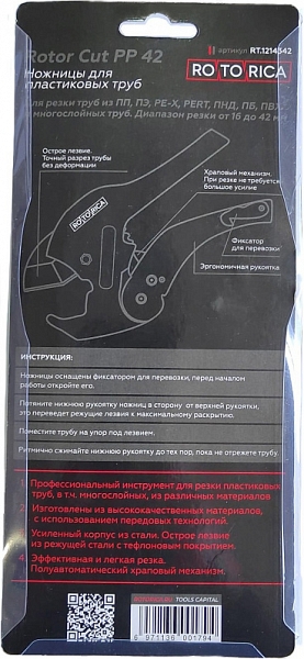 Ножницы для резки пластиковых труб Rotorica Rotor Cut PP 42 (Роторика Ротор Кат ПП 42) предназначены для резки, в первую очередь, полипропиленовых (ПП, PP), а также полиэтиленовых (ПЭ, PE), полибутеновых (ПБ, PB), поливинилхлоридных (ПВХ, PVC), металлопластиковых из сшитого полиэтилена (PEX) и многослойных (МПТ) труб Ø до 42 мм.