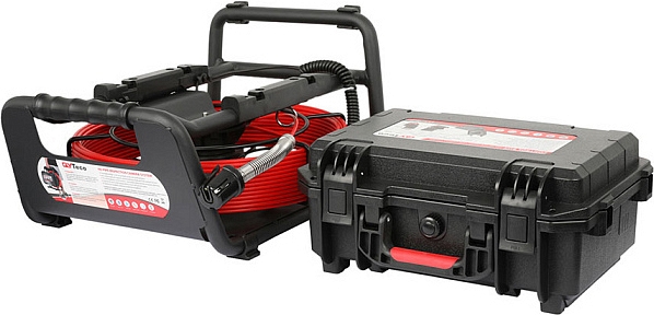 - Головка камеры Ø 21 × 45 мм и проталкиваемый кабель Ø 5,3 мм × 40 м из стекловолокна со счетчиком длины, подходящие для труб Ø 50 – 125 мм, длиной до 40 м